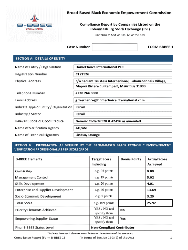 This document is a compliance report submitted by HomeChoice International PLC for their Broad-Based Black Economic Empowerment (B-BBEE) status, including details on the organization\'s ownership, management control, skills development, enterprise and supplier development, and socio-economic development scores as per the Johannesburg Stock Exchange regulations.