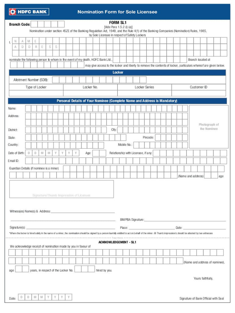 Nomination Form for Sole Licensee FORM SL1Branch Code:[Vide Para 1.5.2 (i) (a)] Nomination under section 45ZE of the Banking Regulation Act, 1949, and the Rule 4(1) of the Banking Companies (Nomination)