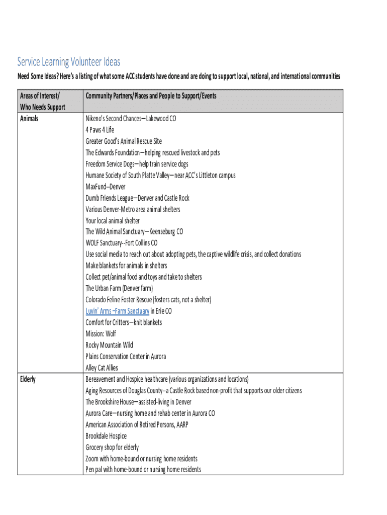 This document provides a comprehensive list of service learning volunteer ideas targeted at students. It highlights various organizations and areas where volunteers can make a difference, including supporting animals, the elderly, children, veterans, individuals experiencing homelessness, and social justice initiatives. It serves as a resource for individuals looking to engage in community service and offers practical suggestions for making an impact locally, nationally, and internationally.