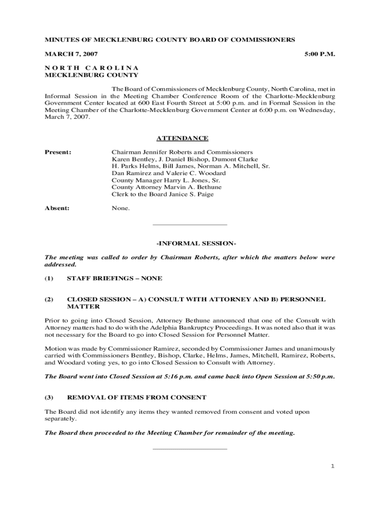 MINUTES OF MECKLENBURG COUNTY BOARD OF COMMISSIONERS MARCH 7, 20075:00 P.M.NORTH CAROLINA MECKLENBURG COUNTY The Board of Commissioners of Mecklenburg County, North Carolina, met in Informal Session