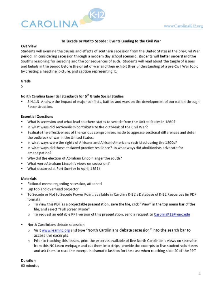 ToSecedeorNottoSecede:EventsLeadingtotheCivilWar Overview StudentswillexaminethecausesandeffectsofsouthernsecessionfromtheUnitedStatesinthepreCivilWar period.Inconsideringsecessionthroughamoderndayschoolscenario,studentswillbetterunderstandthe