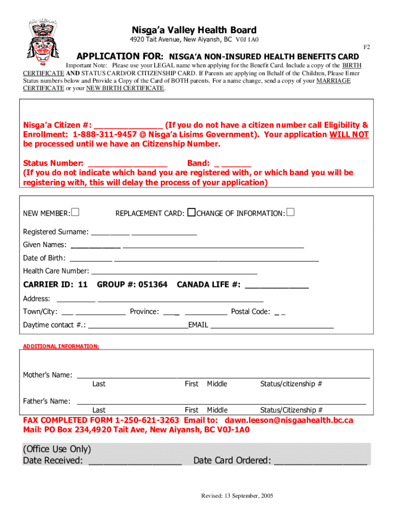 Nisgaa Valley Health Board4920 Tait Avenue, New Aiyansh, BC V0J 1A0 F2APPLICATION FOR: NISGAA NONINSURED HEALTH BENEFITS CARD Important Note: Please use your LEGAL name when applying for the Benefit