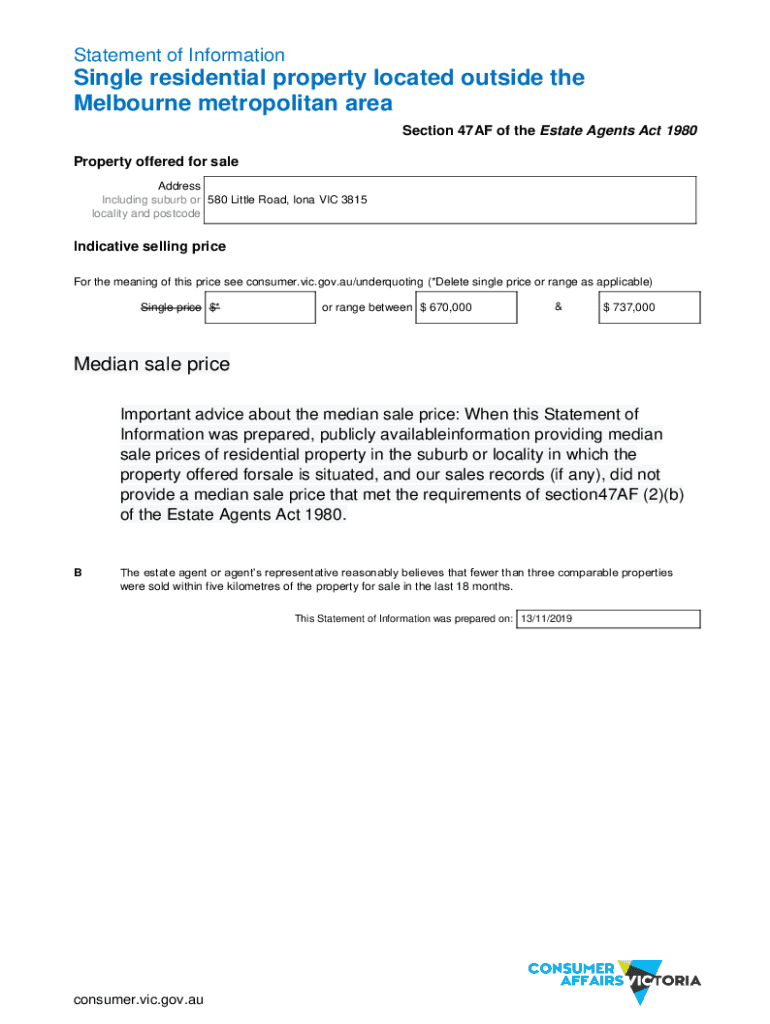 Statement of InformationSingle residential property located outside the Melbourne metropolitan area Section 47AF of the Estate Agents Act 1980 Property offered for sale Address Including suburb or