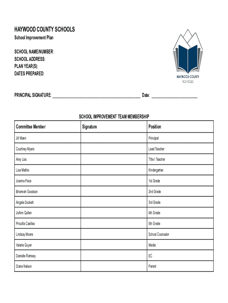 HAYWOOD COUNTY SCHOOLS School Improvement Plan SCHOOL NAME/NUMBER: SCHOOL ADDRESS: PLAN YEAR(S): DATES PREPARED:PRINCIPAL SIGNATURE: ___ Date: ___SCHOOL IMPROVEMENT TEAM MEMBERSHIP Committee MemberSignaturePositionJill