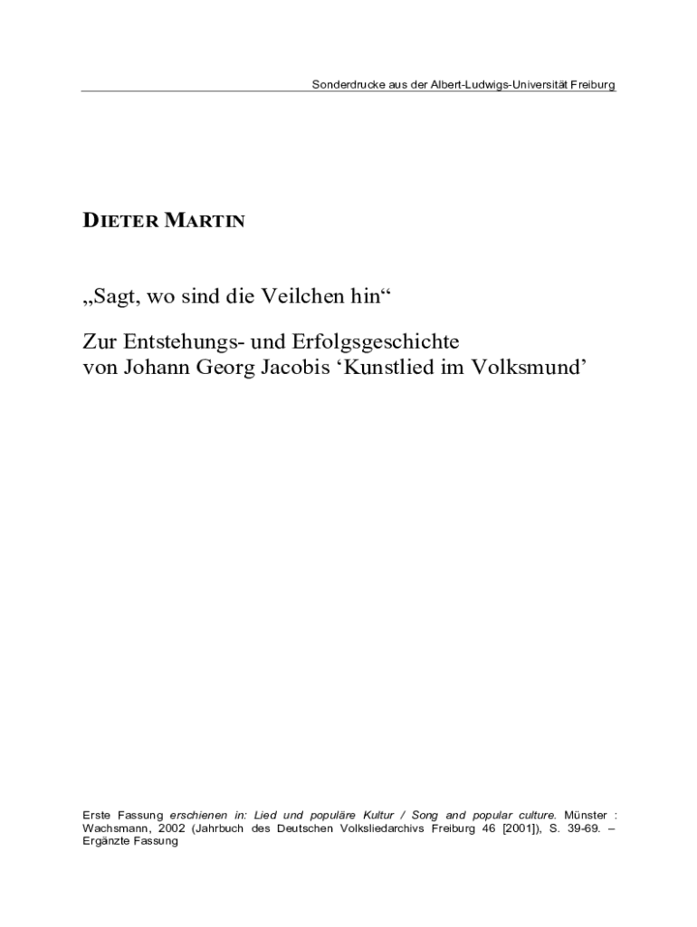 Sonderdrucke aus der AlbertLudwigsUniversitt FreiburgDIETER MARTINSagt, wo sind die Veilchen hin Zur Entstehungs und Erfolgsgeschichte von Johann Georg Jacobis Kunstlied im VolksmundErste Fassung