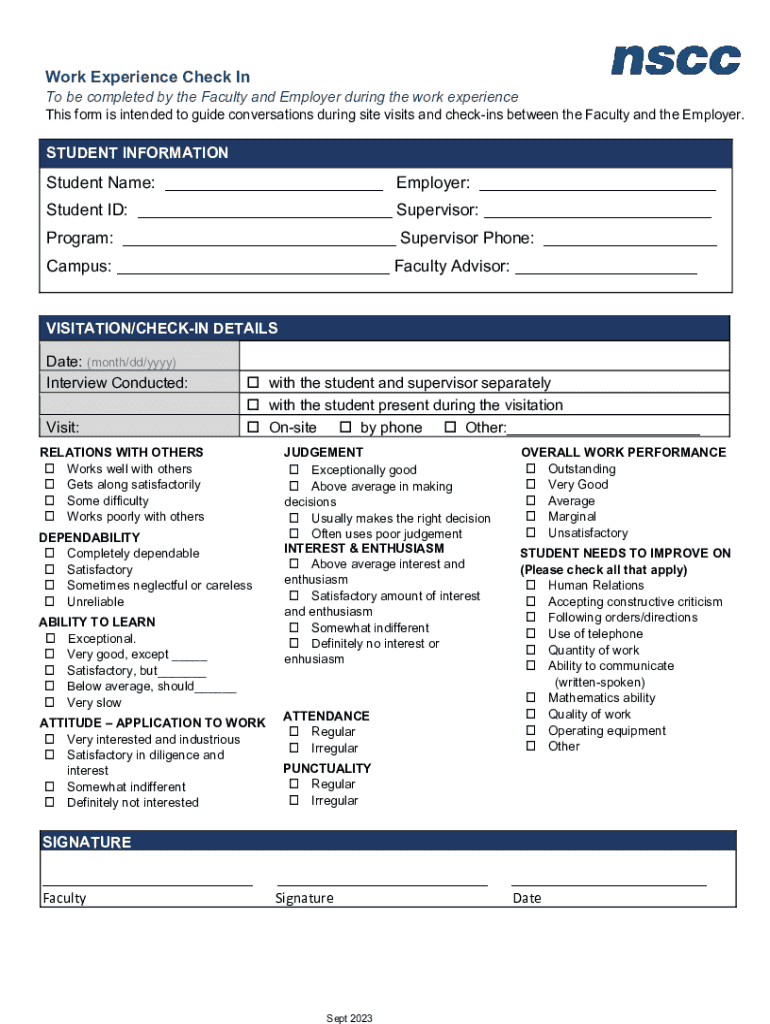 This document is designed for Faculty and Employers to facilitate discussions during work experience site visits and check-ins. It includes sections for student information, assessment of relations, dependability, learning ability, attitude towards work, judgment, interest and enthusiasm, attendance, overall performance, areas for improvement, and punctuality.