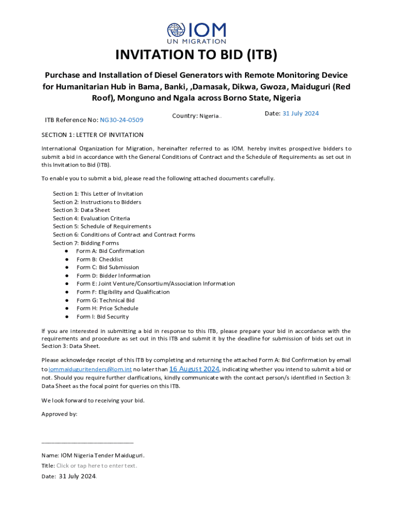 This document outlines the Invitation to Bid (ITB) for the purchase and installation of diesel generators with a remote monitoring device for various locations across Borno State, Nigeria, by the International Organization for Migration (IOM). It includes instructions for bidders, evaluation criteria, bid submission requirements, and details on the scope of work.