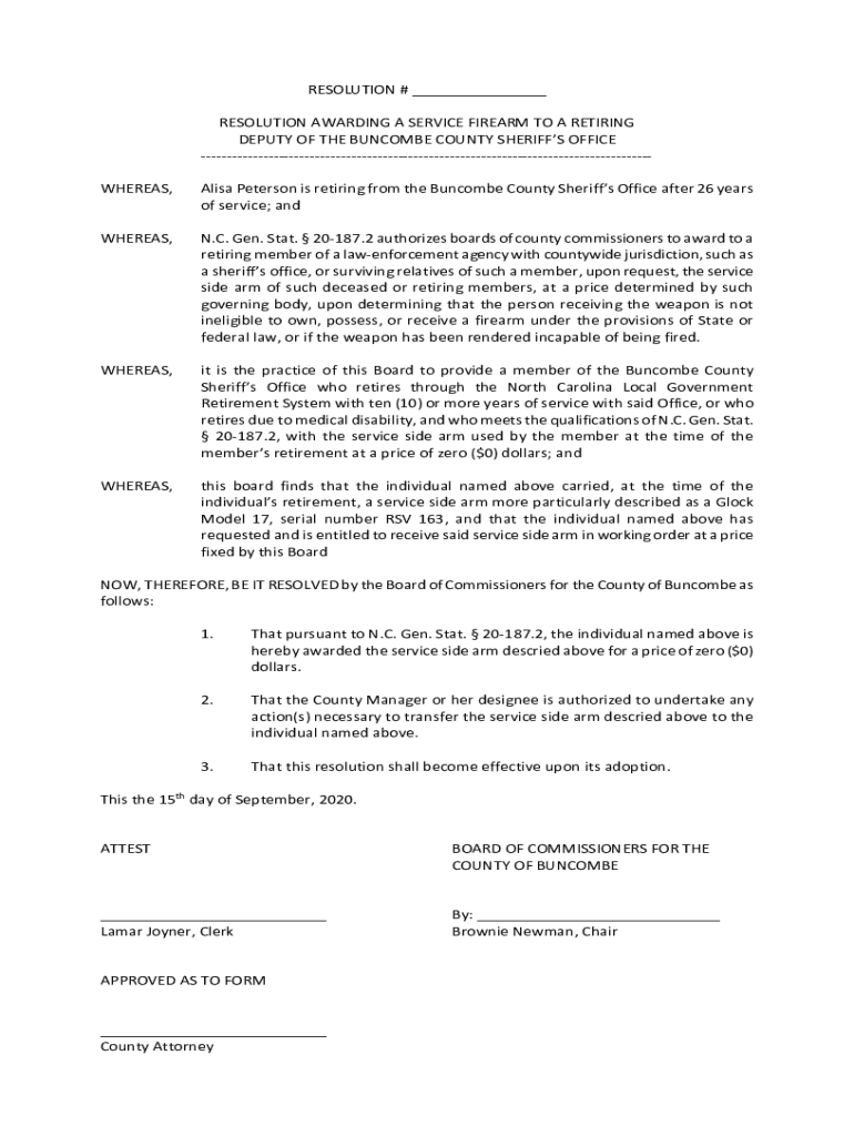 RESOLUTION # ___ RESOLUTION AWARDING A SERVICE FIREARM TO A RETIRING DEPUTY OF THE BUNCOMBE COUNTY SHERIFFS OFFICE WHEREAS,Alisa Peterson is retiring from the Buncombe County Sheriffs Office after
