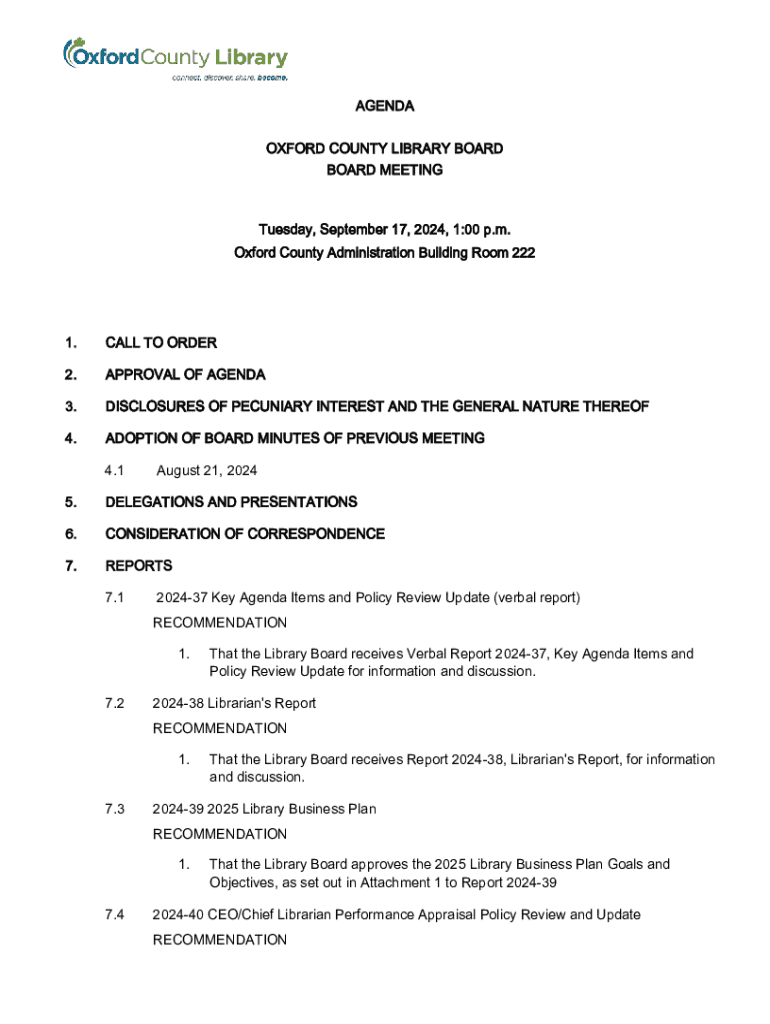 AGENDA OXFORD COUNTY LIBRARY BOARD BOARD MEETINGTuesday, September 17, 2024, 1:00 p.m. Oxford County Administration Building Room 2221.CALL TO ORDER2.APPROVAL OF AGENDA3.DISCLOSURES OF PECUNIARY INTEREST