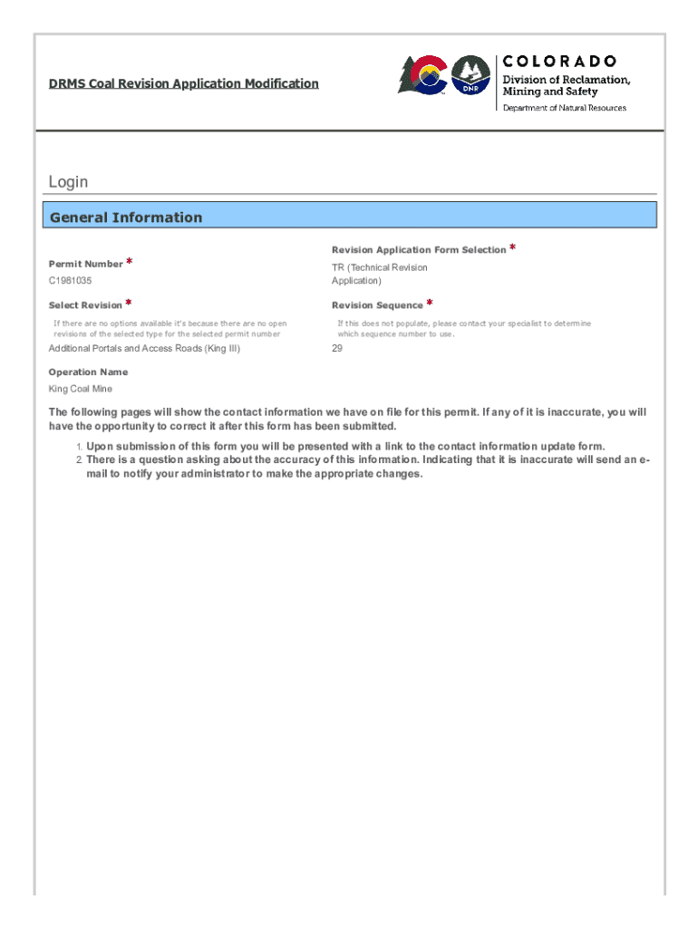 DRMS Coal Revision Application ModificationLogin General Information Permit Number *Revision Application Form Selection *C1981035TR (Technical Revision Application)Select Revision *Revision Sequence