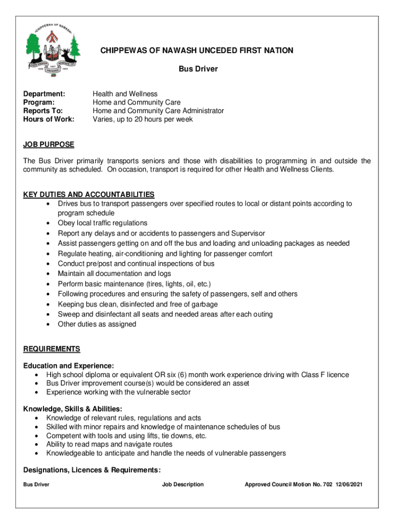 CHIPPEWAS OF NAWASH UNCEDED FIRST NATION Bus Driver Department: Program: Reports To: Hours of Work:Health and Wellness Home and Community Care Home and Community Care Administrator Varies, up to 20
