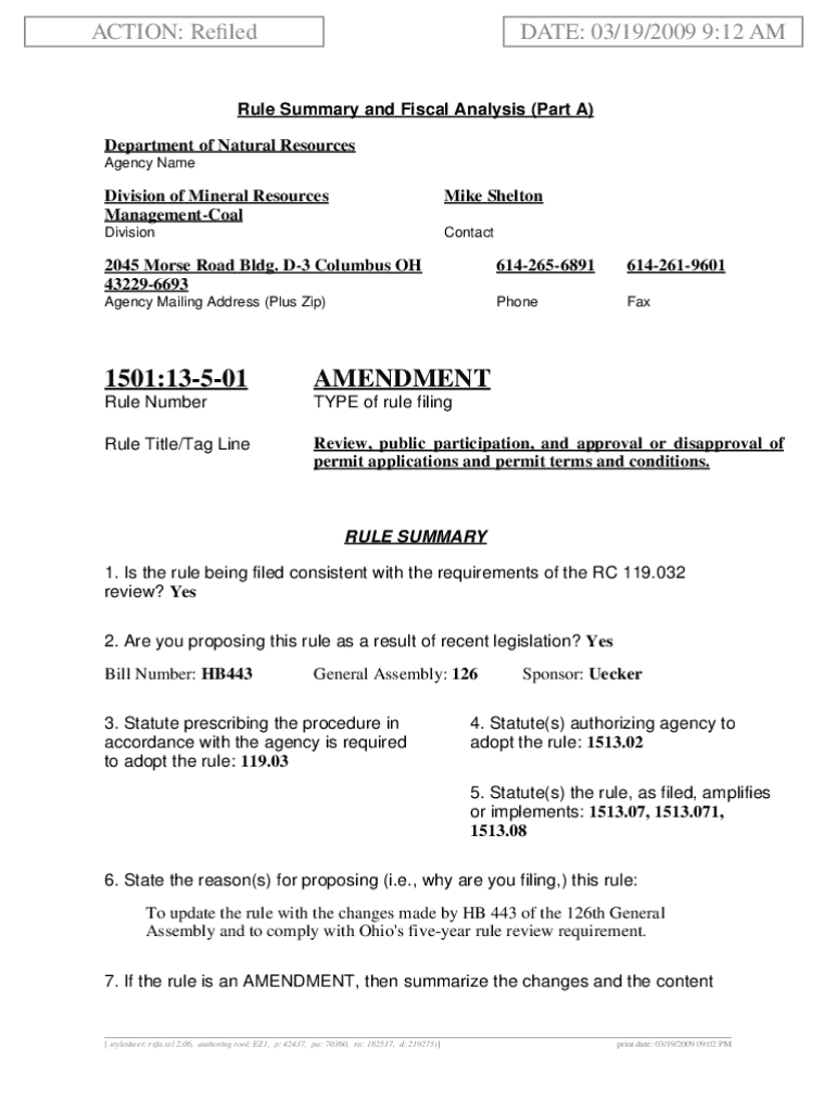 ACTION: RefiledDATE: 03/19/2009 9:12 AMRule Summary and Fiscal Analysis (Part A) Department of Natural Resources Agency NameDivision of Mineral Resources ManagementCoalMike SheltonDivisionContact2045