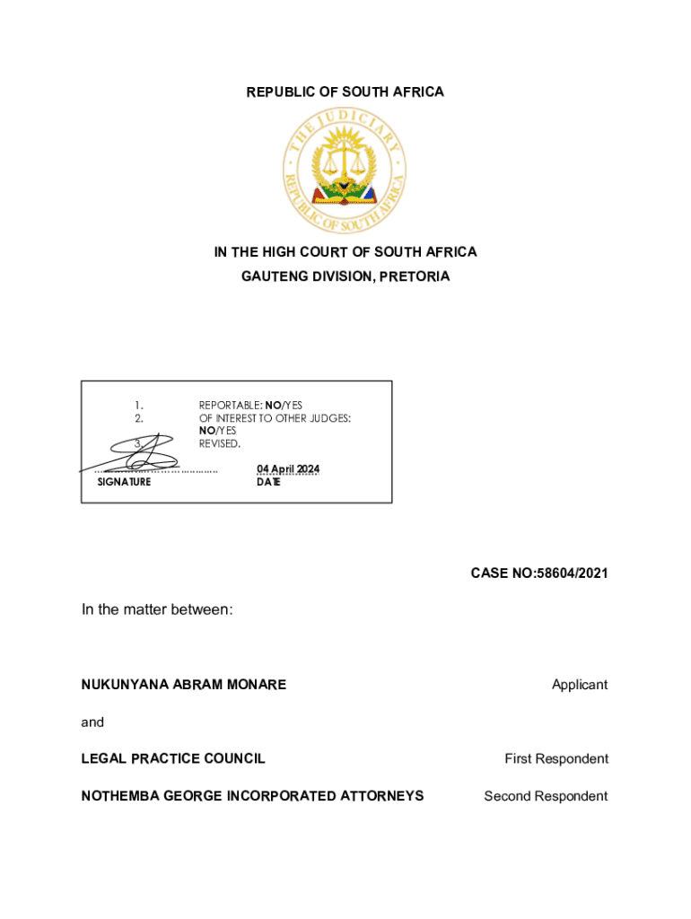 REPUBLIC OF SOUTH AFRICAIN THE HIGH COURT OF SOUTH AFRICA GAUTENG DIVISION, PRETORIA1. 2. 3.REPORTABLE: NO/YES OF INTEREST TO OTHER JUDGES: NO/YES REVISED................ SIGNATURE04 April 2024 DATECASE