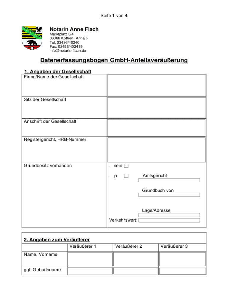 Seite 1 von 4Notarin Anne Flach Marktplatz 3/4 06366 Kthen (Anhalt) Tel: 03496/40240 Fax: 03496/402419 info@notarinflach.deDatenerfassungsbogen GmbHAnteilsveruerung 1. Angaben der Gesellschaft Firma/Name