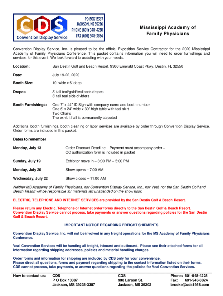 This document serves as a comprehensive guide for vendors attending the 2020 Mississippi Academy of Family Physicians Conference, outlining essential information for ordering booth furnishings and services, venue details, and important deadlines. It provides guidelines for ordering electrical, telephone, and internet services, as well as freight handling and material shipping conditions.