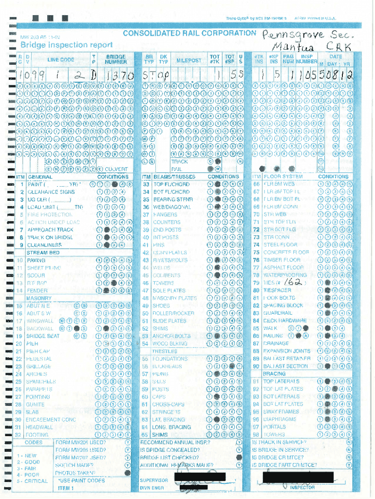 . . . ..ATR99 Printed In U.S .ATransOptic by NCS EM1504566CONSOLIDATED RAIL CORPORATIONMW 203 A5 1192p..fL.tWl S,:j rove,_ S e.c ... Bridge inspection report BR TYPLINE CODErC\'\'\'uTOT T TOT #TK