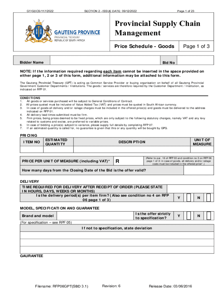 This document outlines the pricing schedule for goods required by the Gauteng Provincial Treasury, serving as a Common Service Provider for the Gauteng Provincial Government. It includes conditions for bidding, requirements for pricing, delivery, specifications, warranties, and local production declarations.