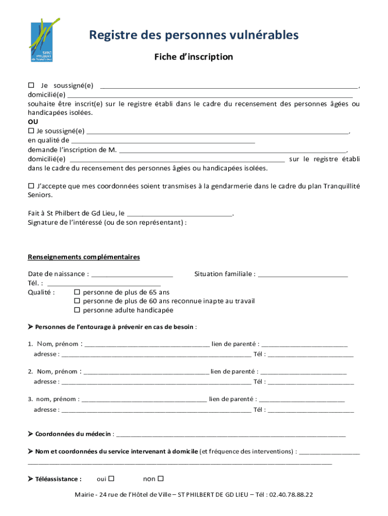 Registre des personnes vulnrables Fiche dinscription Je soussign(e) ___, domicili(e) ___ souhaite tre inscrit(e) sur le registre tabli dans le cadre du recensement des personnes ges ou handicapes