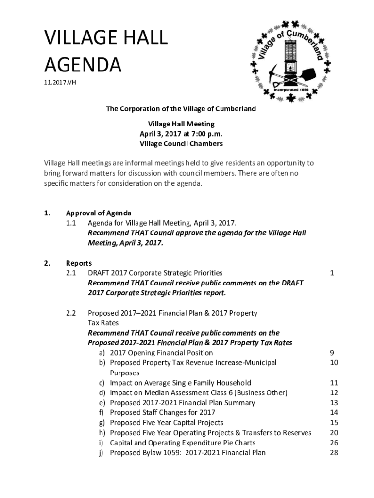 VILLAGE HALL AGENDA 11.2017.VHThe Corporation of the Village of Cumberland Village Hall Meeting April 3, 2017 at 7:00 p.m. Village Council Chambers Village Hall meetings are informal meetings held