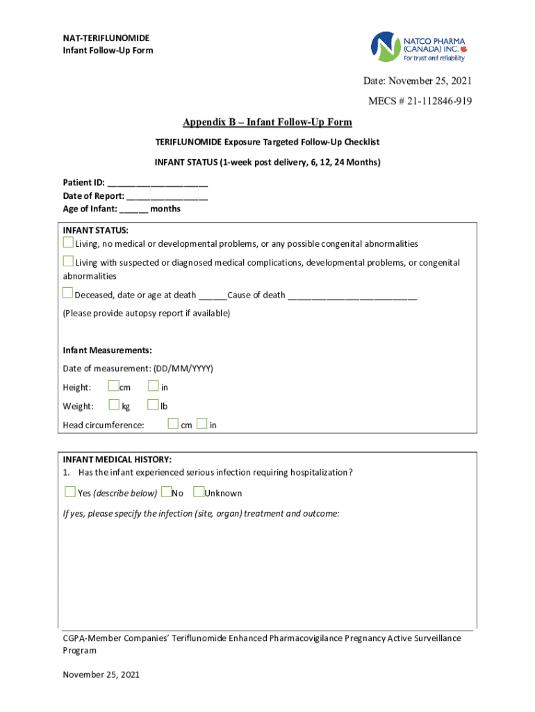NATTERIFLUNOMIDE Infant FollowUp FormDate: November 25, 2021 MECS # 21112846919 Appendix B Infant FollowUp Form TERIFLUNOMIDE Exposure Targeted FollowUp Checklist INFANT STATUS (1week post delivery,