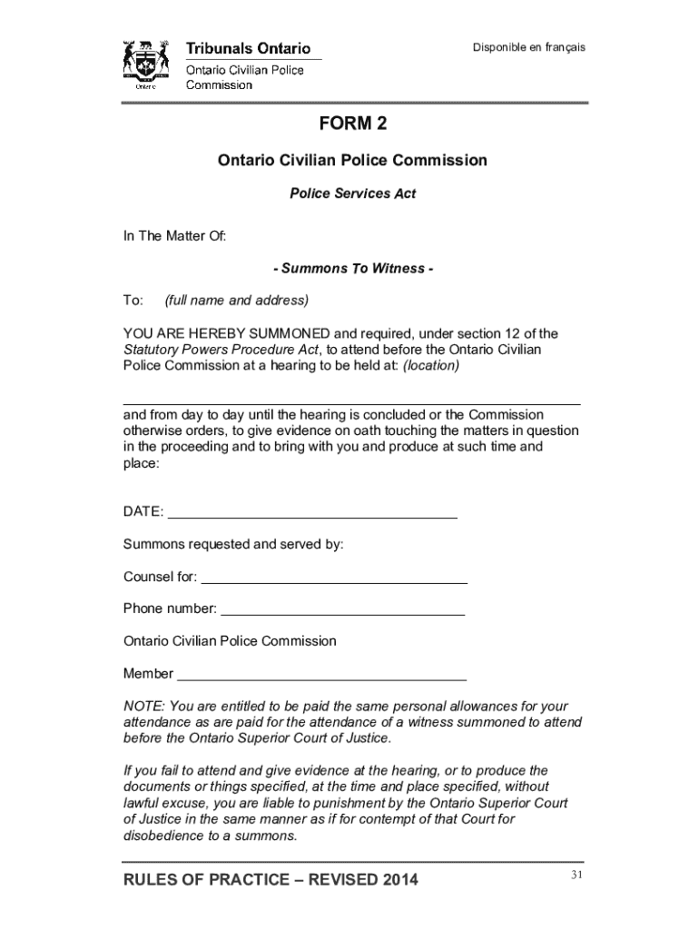 Disponible en franaisFORM 2 Ontario Civilian Police Commission Police Services Act In The Matter Of: Summons To Witness To:(full name and address)YOU ARE HEREBY SUMMONED and required, under section