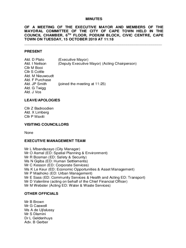 MINUTES OF A MEETING OF THE EXECUTIVE MAYOR AND MEMBERS OF THE MAYORAL COMMITTEE OF THE CITY OF CAPE TOWN HELD IN THE COUNCIL CHAMBER, 6TH FLOOR, PODIUM BLOCK, CIVIC CENTRE, CAPE TOWN ON TUESDAY,