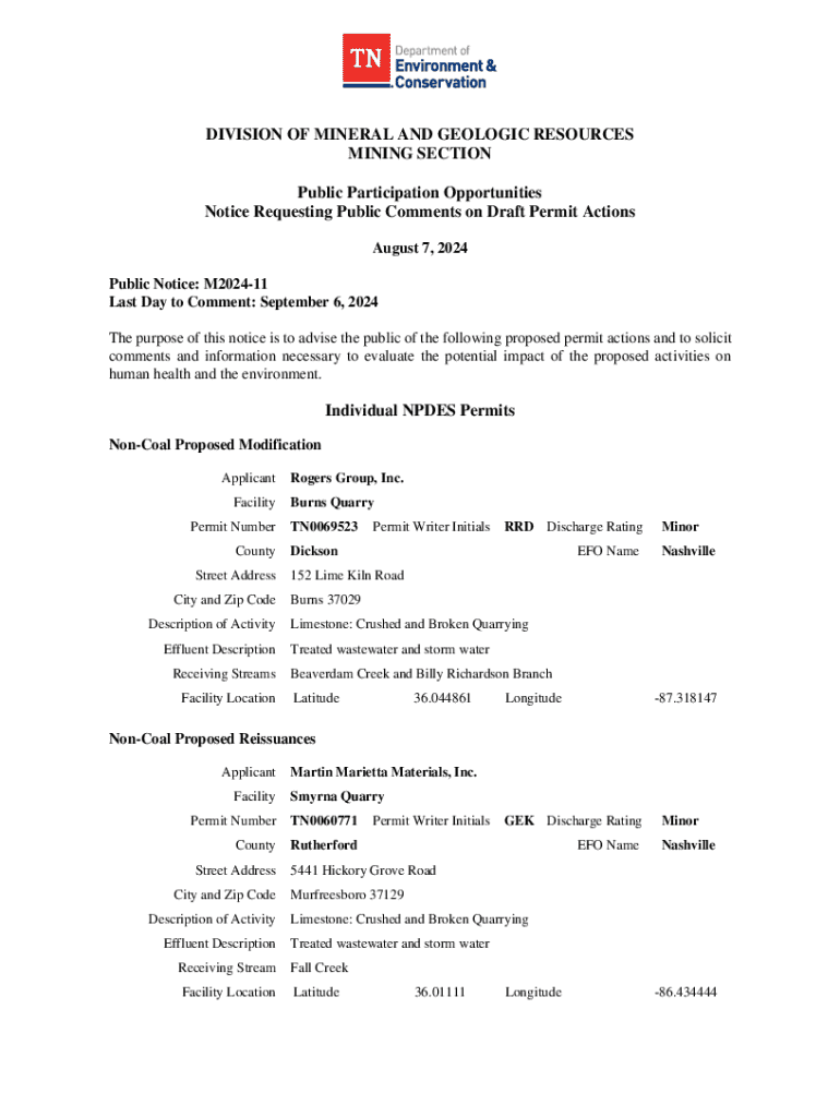 This document serves as a public notice to solicit comments on proposed permit actions regarding mining operations, including individual NPDES permits and modifications for various quarries and mining facilities within Tennessee. The goal is to evaluate the potential environmental impact of these activities and engage the public in the decision-making process.