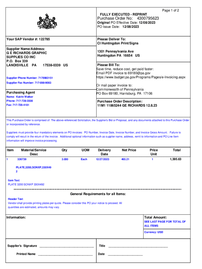 Page 1 of 2 FULLY EXECUTED REPRINTPurchase Order No:4300795623Original PO Effective Date: 12/08/2023 PO Issue Date: 12/08/2023Your SAP Vendor #: 122785Please Deliver To: CI Huntingdon Print/SignsSupplier
