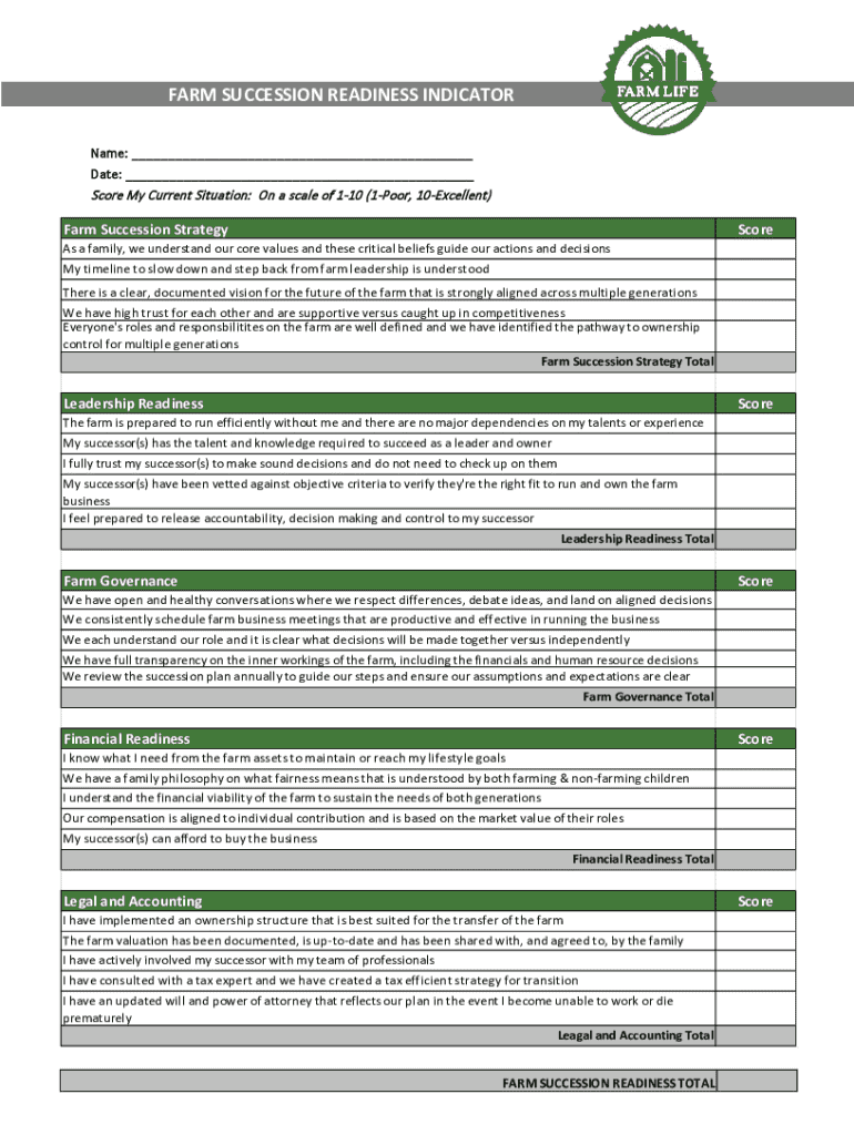 FARM SUCCESSION READINESS INDICATOR Name: ___ Date: ___Score My Current Situation: On a scale of 110 (1Poor, 10Excellent)Farm Succession StrategyScoreAs a family, we understand our core values and