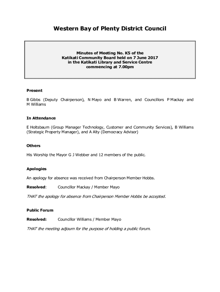 Western Bay of Plenty District CouncilMinutes of Meeting No. K5 of the Katikati Community Board held on 7 June 2017 in the Katikati Library and Service Centre commencing at 7.00pmPresent B Gibbs (Deputy