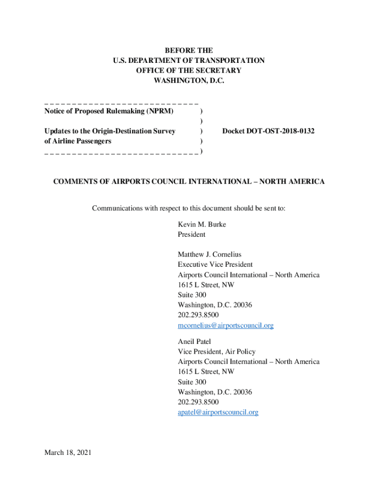 This document contains the comments of Airports Council International – North America (ACI-NA) in response to the U.S. Department of Transportation\'s (DOT) Notice of Proposed Rulemaking regarding updates to the Origin-Destination Survey of Airline Passengers. It discusses the importance of accurate aviation traffic data collection and proposes enhancements aimed at improving the survey\'s coverage, accuracy, and timeliness to benefit airports, airlines, and government agencies.