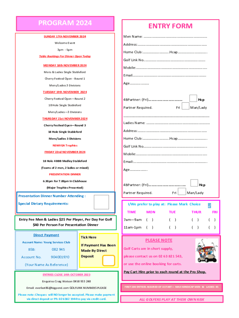 PROGRAM 2024ENTRY FORMSUNDAY 17th NOVEMBER 2024Men Name: Welcome EventAddress:3pm 5pmHome Club:..Hcap..Table Bookings For Dinner Open TodayGolf Link No.... MONDAY 18th NOVEMBER 2024 Mens & Ladies