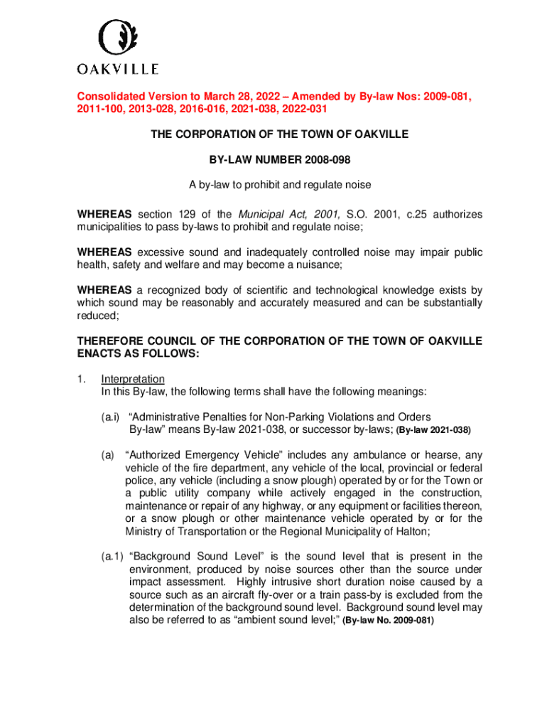 This by-law regulates and prohibits noise emissions within the Town of Oakville, aiming to protect public health, safety, and welfare from excessive sound disturbances. The by-law outlines definitions, general prohibitions, time and place restrictions, sound level limitations, exemptions, and penalties for non-compliance.