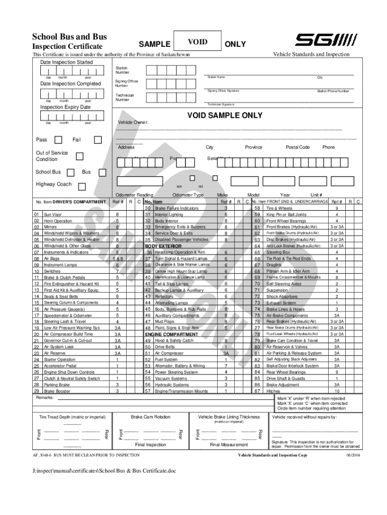 School Bus and BusVOIDSAMPLEInspection CertificateONLY Vehicle Standards and InspectionThis Certificate is issued under the authority of the Province of Saskatchewan Date Inspection Started Station