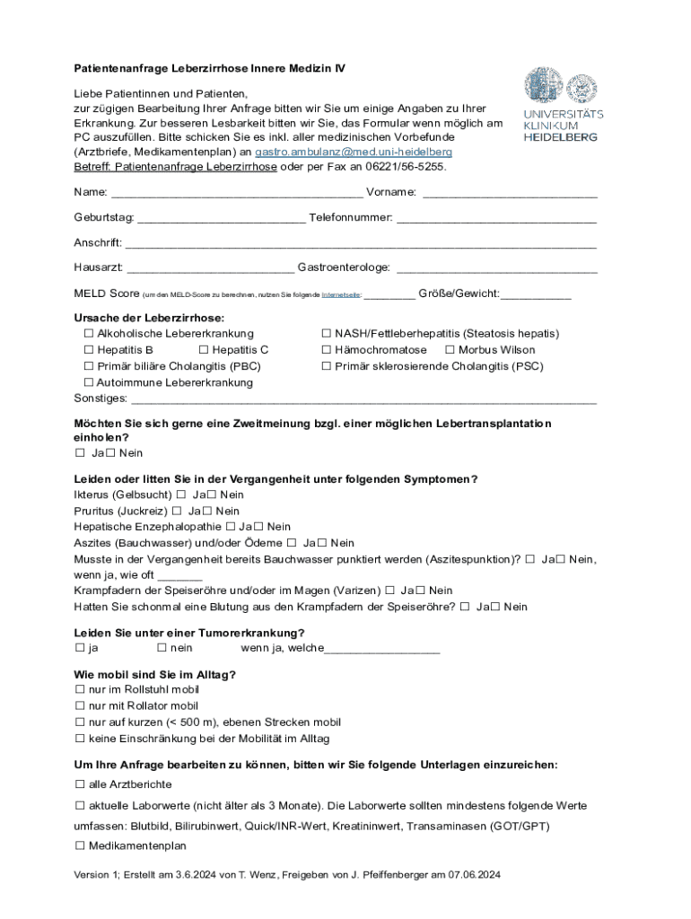 Patientenanfrage Leberzirrhose Innere Medizin IV Liebe Patientinnen und Patienten, zur zgigen Bearbeitung Ihrer Anfrage bitten wir Sie um einige Angaben zu Ihrer Erkrankung. Zur besseren Lesbarkeit