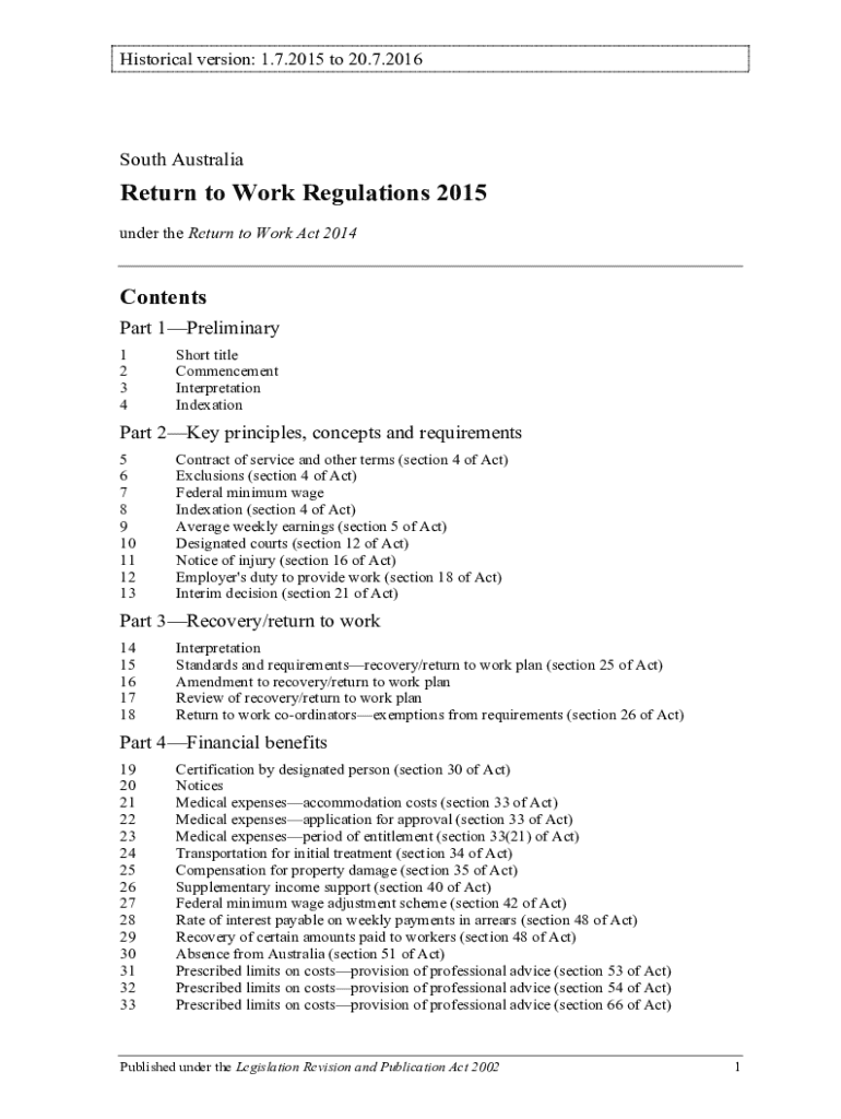 Historical version: 1.7.2015 to 20.7.2016South AustraliaReturn to Work Regulations 2015 under the Return to Work Act 2014Contents Part 1Preliminary 1 2 3 4Short title Commencement Interpretation IndexationPart