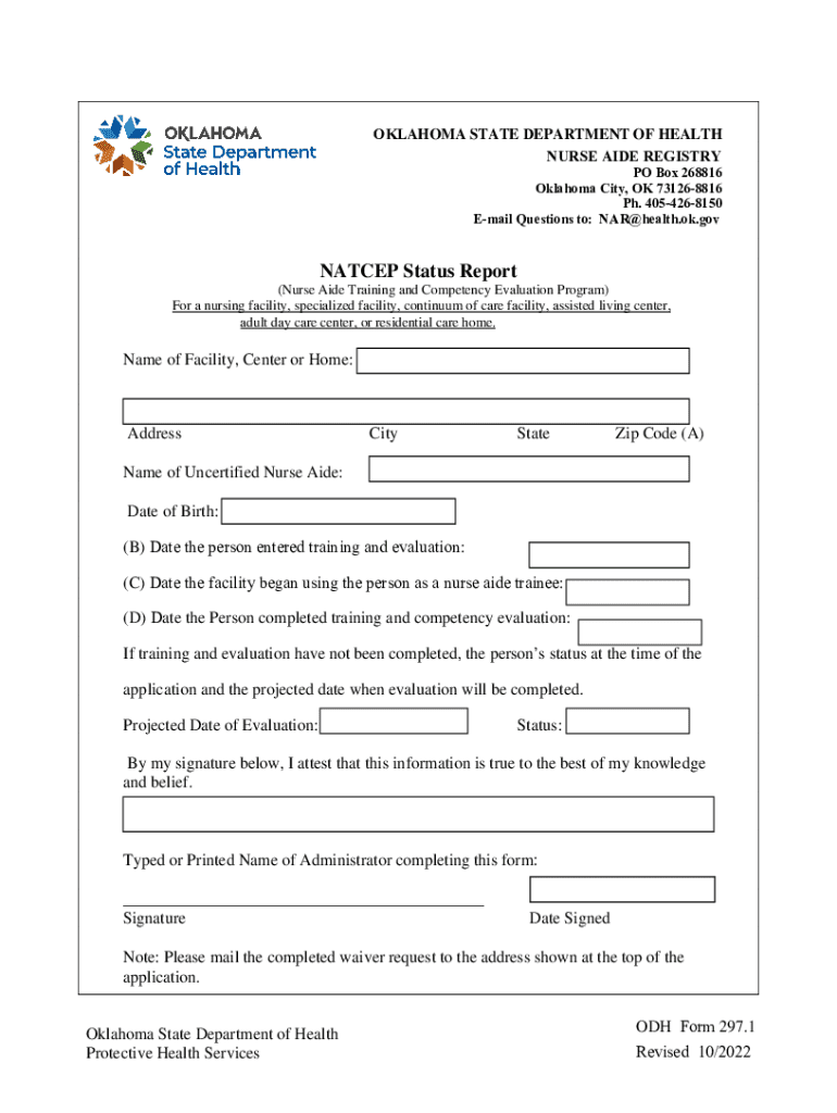 This document is a status report for the Nurse Aide Training and Competency Evaluation Program (NATCEP) used by various types of health facilities in Oklahoma. It includes sections to report the status of uncertified nurse aides, including their training and evaluation dates, and requires a signature from the facility administrator to confirm the information provided.