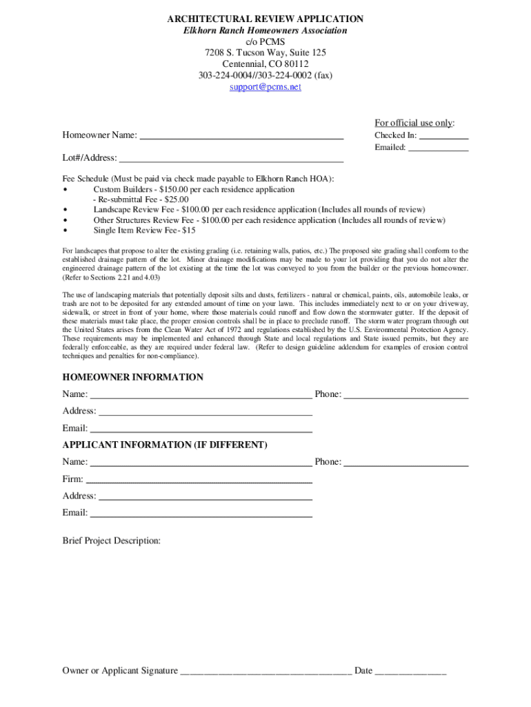 This document outlines the procedures and fees for homeowners submitting architectural review applications to the Elkhorn Ranch Homeowners Association. It includes homeowner and applicant information, project description, and compliance with landscaping and drainage regulations.