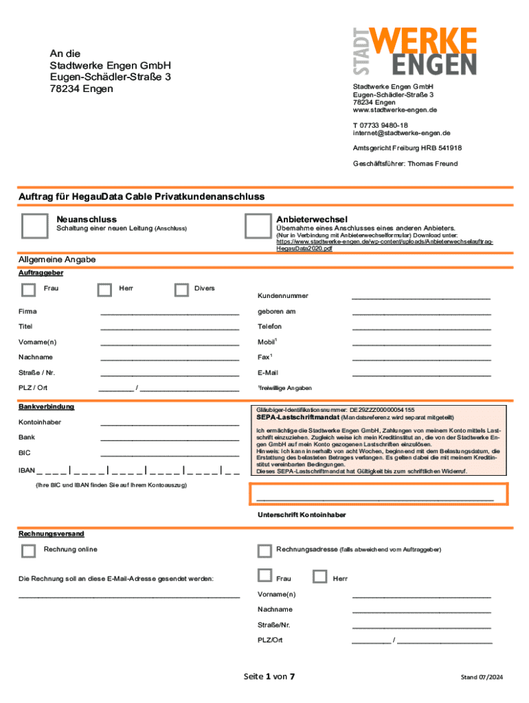 Der Auftrag für Hegaudata Cable ist ein offizielles Dokument, das zur Beantragung und Genehmigung von Kabelverlegungen dient.