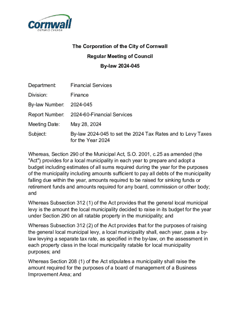 This document outlines the enactment of By-law 2024-045 by The Corporation of the City of Cornwall to establish the tax rates and levy required for municipal purposes for the year 2024, including specified amounts for business improvement areas and regulations regarding tax payments and penalties.
