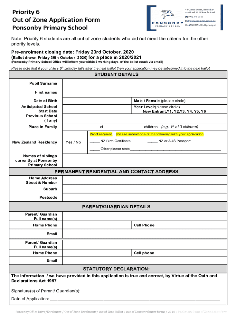 44 Curran Street, Herne Bay Auckland, 1011 New Zealand [t] (09) 376 3568 [w] www.ponsprim.school.nz Dr ANNE MALCOLM principalNote: Priority 6 students are all out of zone students who did not meet