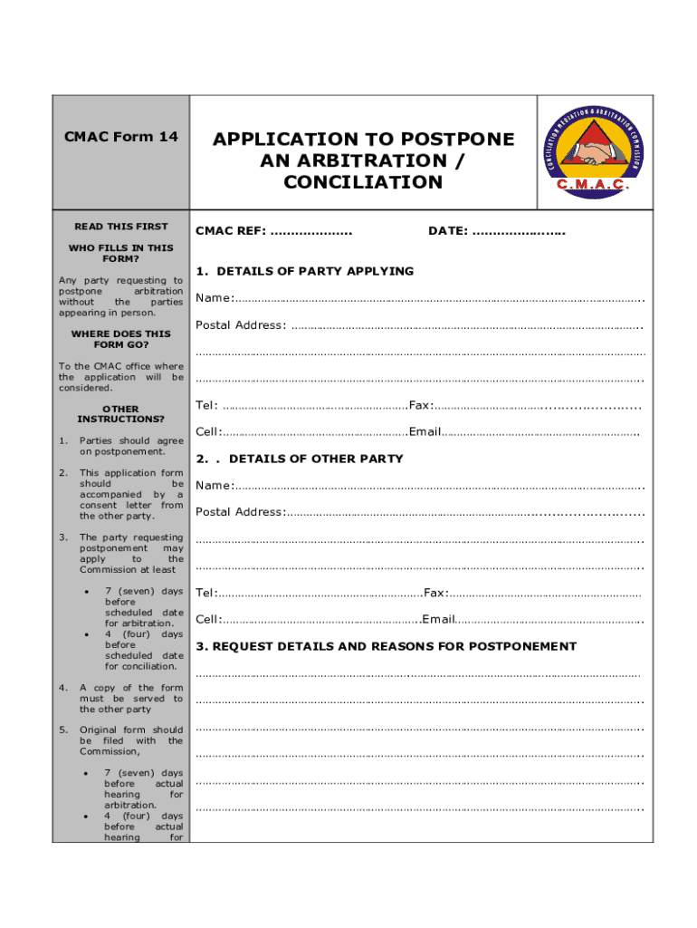 CMAC Form 14READ THIS FIRST WHO FILLS IN THIS FORM? Any party requesting to postpone arbitration without the parties appearing in person. WHERE DOES THIS FORM GO? To the CMAC office where the application