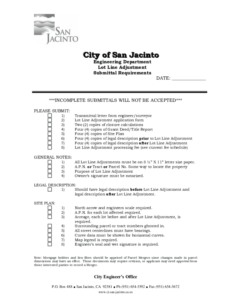 City of San Jacinto Engineering Department Lot Line Adjustment Submittal RequirementsDATE: ___***INCOMPLETE SUBMITTALS WILL NOT BE ACCEPTED*** PLEASE SUBMIT: 1) 2) 3) 4) 5) 6) 7) 8)Transmittal letter