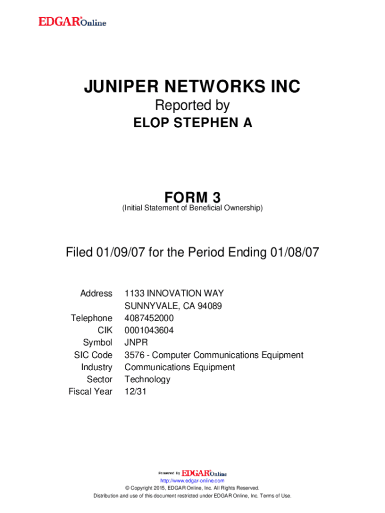 This document is an Initial Statement of Beneficial Ownership of Securities filed by Stephen A. Elop, an officer of Juniper Networks Inc., reporting on beneficial ownership of securities as required by the SEC. The form indicates no securities are beneficially owned by the reporting person as of the specified date.