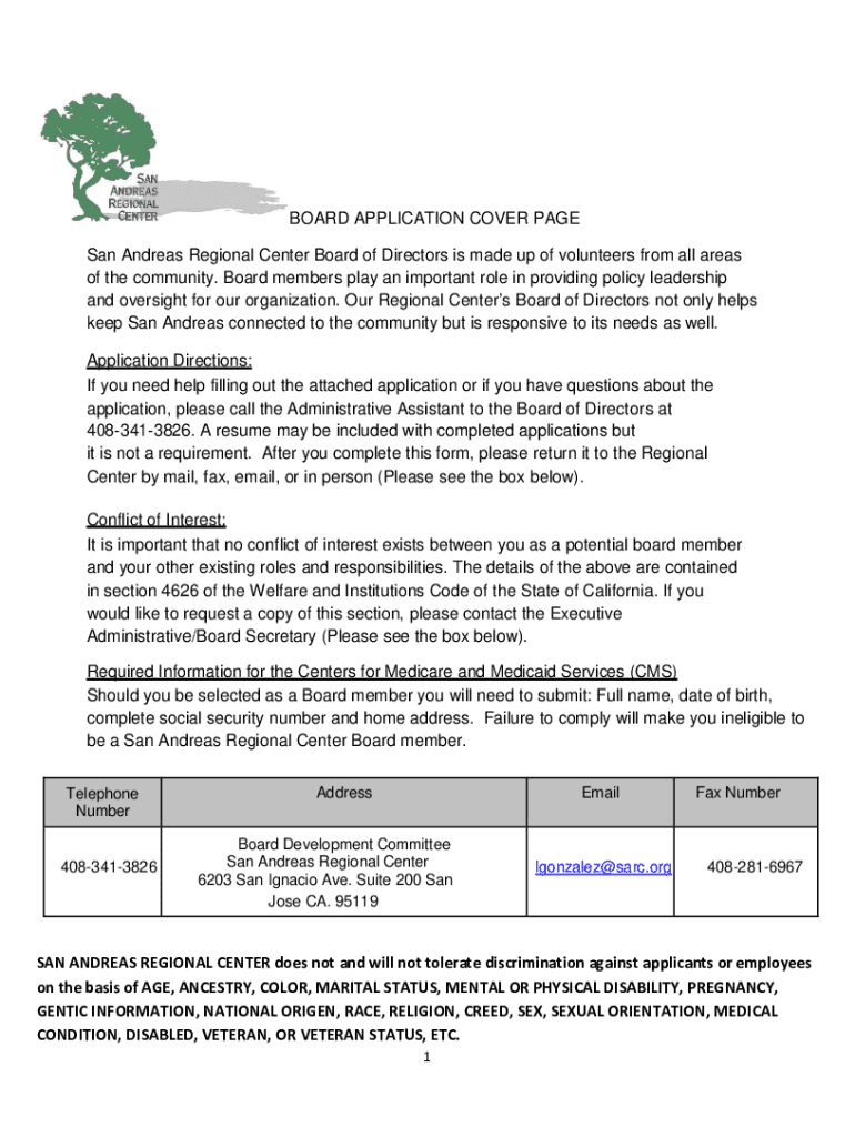 Get the free board application cover page - San Andreas Regional Center