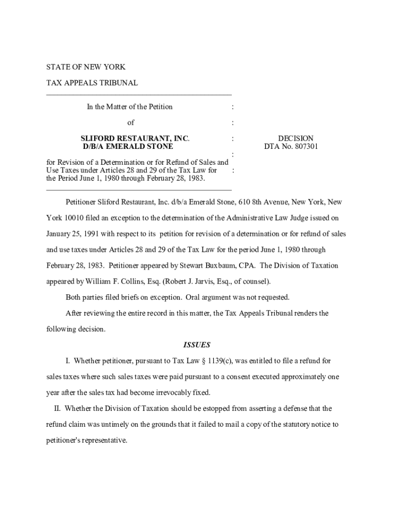 This document is a decision from the New York State Tax Appeals Tribunal regarding the petition filed by Sliford Restaurant, Inc. for a revision of a determination or for a refund of sales and use taxes. It addresses issues of tax evaluation for a bar and grill business over a specified period and discusses the administrative processes, the role of representatives, and the validity of consent forms in tax assessment.