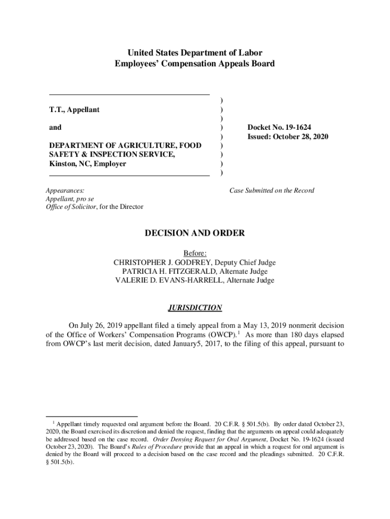 This document outlines the decision and order of the Employees\' Compensation Appeals Board regarding T.T.\'s appeal against the Department of Agriculture, Food Safety & Inspection Service, concerning the denial of his claim for a consequential right shoulder condition resulting from previously accepted work-related injuries.