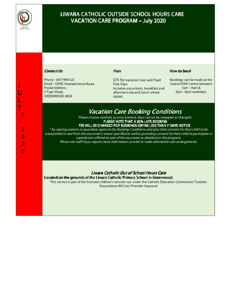 LIWARA CATHOLIC OUTSIDE SCHOOL HOURS CARE VACATION CARE PROGRAM July 2020J U L Y / 2 0 2 0Contact UsFeesHow to bookPhone 0477994123 Email OSHC.liwara@cewa.edu.au Postal Address 5 Tuart Road, GREENWOOD