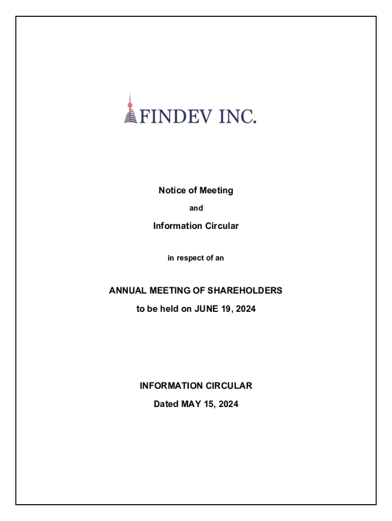 This document is a Notice of Meeting and Information Circular for the Annual Meeting of Shareholders for Findev Inc., scheduled to be held on June 19, 2024. It outlines the purposes of the meeting, procedures for voting, proxy information, and details on the election of directors, appointment of auditors, and re-approval of the stock option plan. It includes a report of the financial statements and necessary information for shareholders to participate in the meeting.