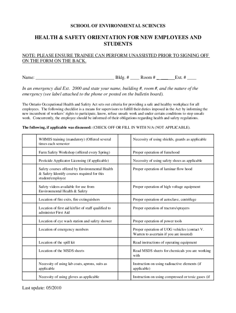 SCHOOL OF ENVIRONMENTAL SCIENCESHEALTH & SAFETY ORIENTATION FOR NEW EMPLOYEES AND STUDENTS NOTE: PLEASE ENSURE TRAINEE CAN PERFORM UNASSISTED PRIOR TO SIGNING OFF ON THE FORM ON THE BACK.Name: ___